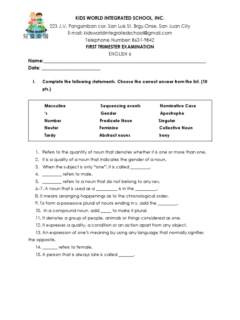 First Trimester Exam English 6 PDF Grammatical Gender Noun